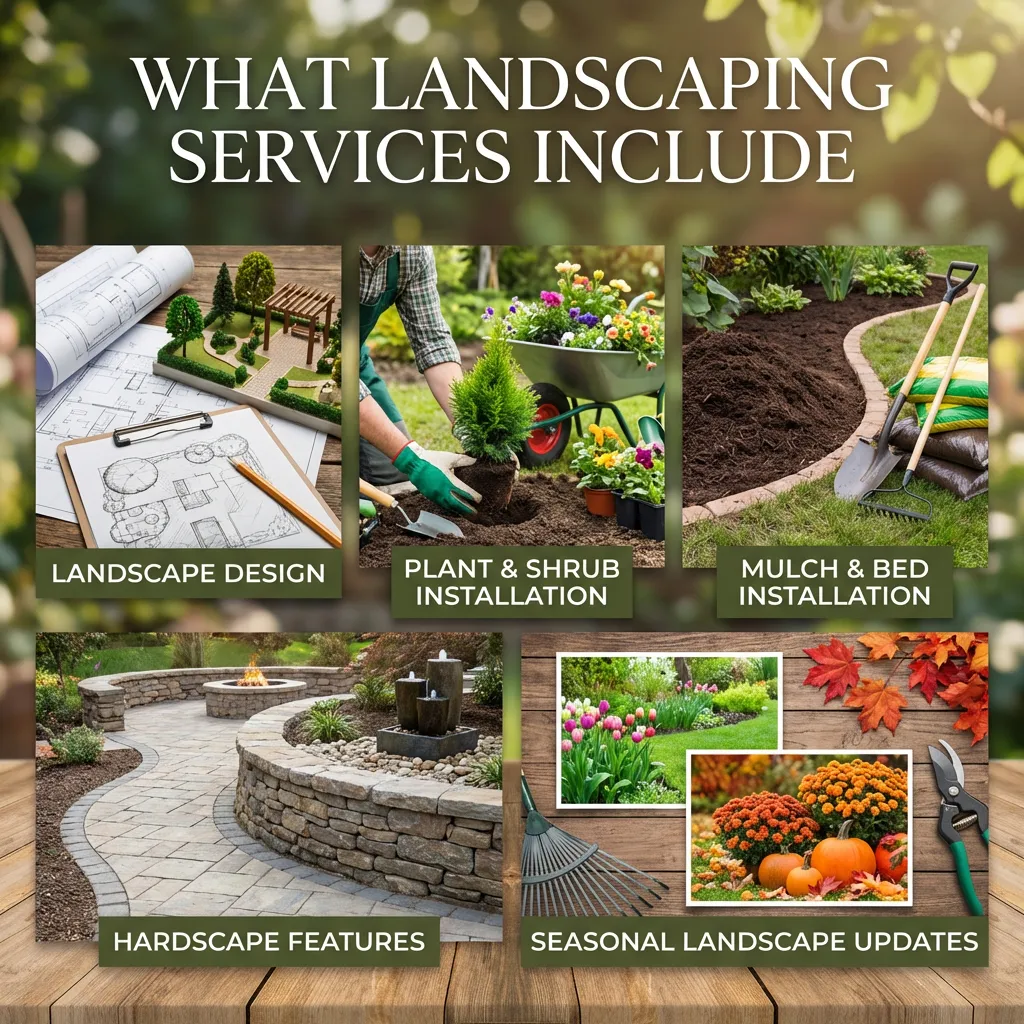Landscaping focuses on plant installation, design, and structural outdoor improvements.