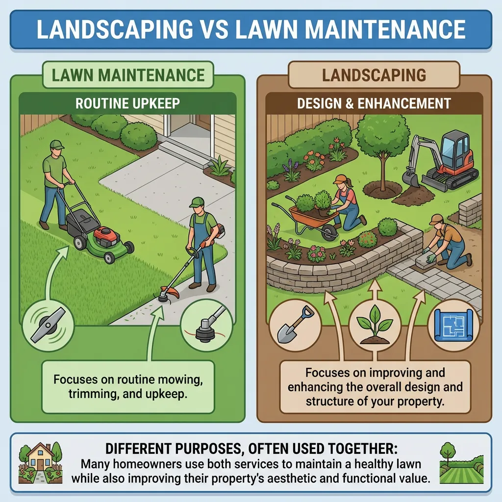 Lawn maintenance focuses on routine mowing, trimming, and upkeep.
