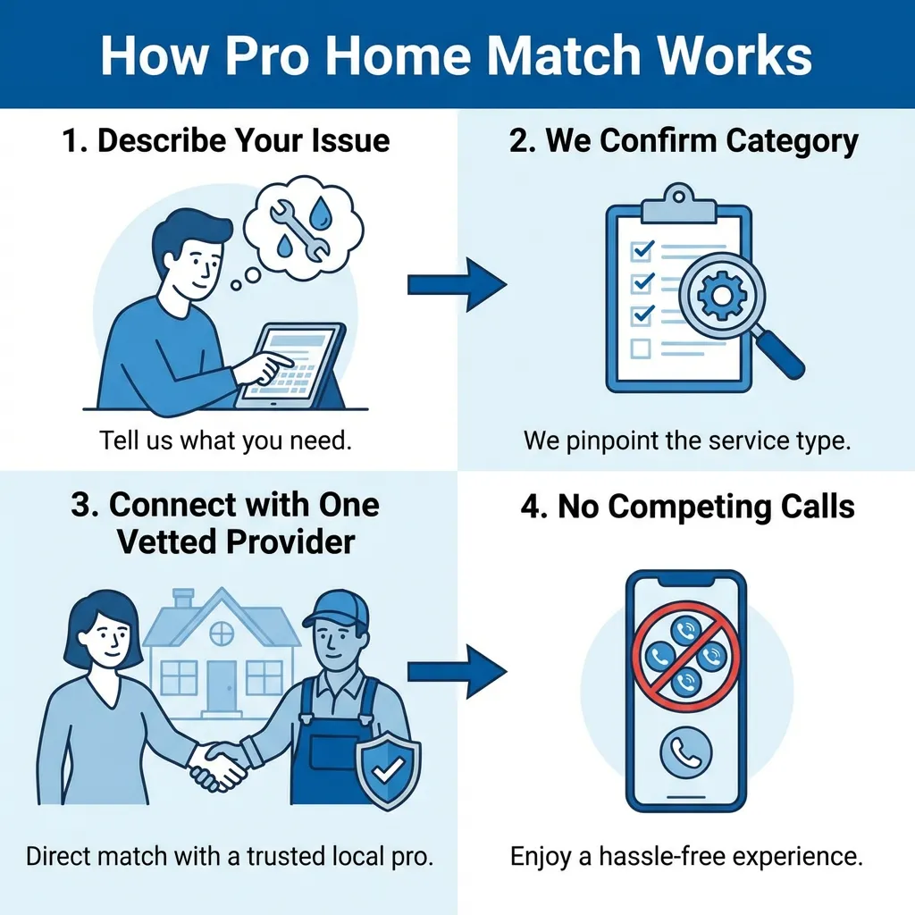 Plumbing services range from everyday fixes like drips and leaks to major projects such as water heater replacement or emergency repairs. PRO HOME MATCH helps homeowners connect with one vetted local plumbing provider who specializes in the exact service you need in your area.